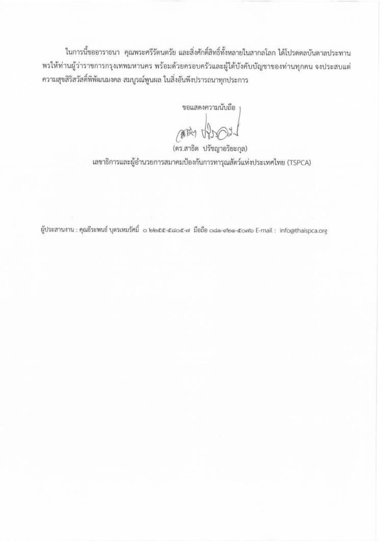 สมาคมป้องกันการทารุณสัตว์แห่งประเทศไทย (TSPCA)และองค์กรเครือข่าย ได้ทำหนังสือยื่นต่อผู้ว่า กทม. เพื่อ