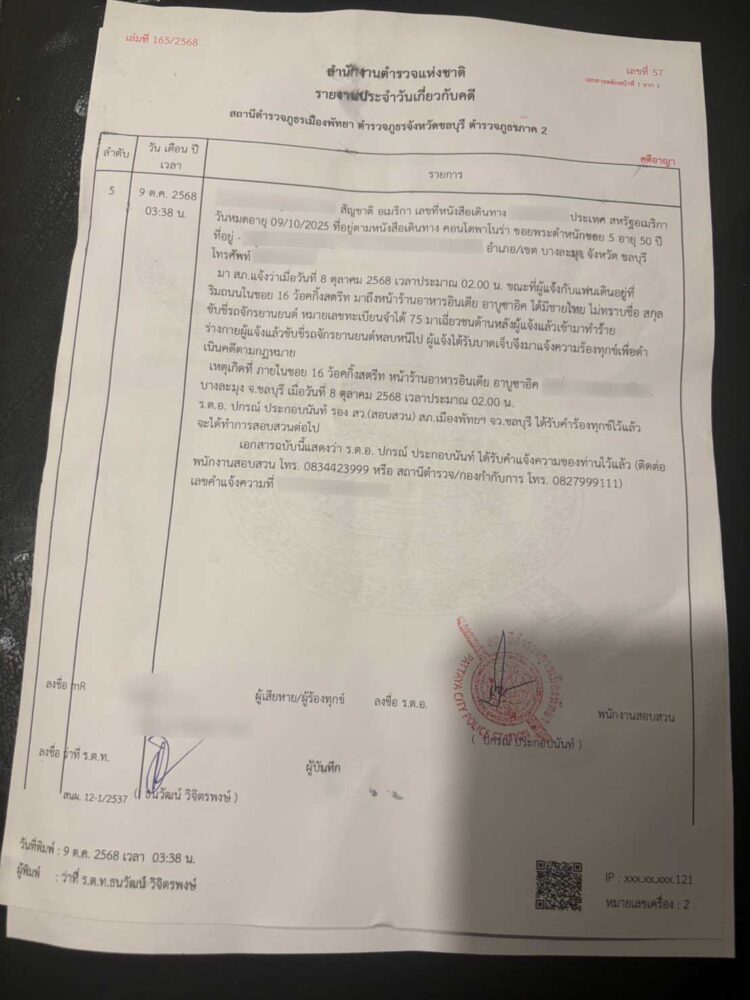 ค่ำคืนของวันพฤหัสบดี ที่ 9 ตุลาคม 2568 Mr Quincy Nguyen Tran อายุ 50 ปี สัญชาติ อเมริกา เลขที่หนังสือเดินทาง A36340377 ประเทศ สหรัฐอเมริกา พร้อมกับครอบครัว ได้ท่องเที่ยว และมารับประทานอาหาร อยู่ที่ร้านอาหารแห่งหนึ่ง หน้าถนนสายชายหาดเมืองพัทยา (พัทยาใต้) และกำลังจะเดินกลับที่พัก ระหวางขาเดินกลับมาถึงหน้าร้านอาหารอินเดีย ภายในถนนคนเดิน วอร์คกิ้งสตรีท เมืองพัทยา ได้มีชายไทยขับมอเตอร์ไชร์ขับเข้ามาเบียด และชนเข้าที่ด้วนหลัง