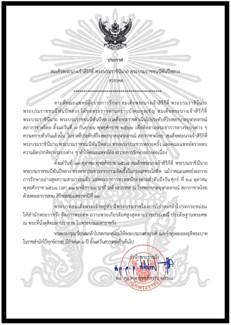 รายงานพิเศษ ประกาศสำนักพระราชวัง สมเด็จพระนางเจ้าสิริกิติ์ พระบรมราชินีนาถ พระบรมราชชนนีพันปีหลวงสวรรคต โดย bong bong - 25 ตุลาคม 2568 4 25 ต.ค. 2568 ประกาศสำนักพระราชวัง สมเด็จพระนางเจ้าสิริกิติ์ พระบรมราชินีนาถ พระบรมราชชนนีพันปีหลวงสวรรคต ธ สถิตในดวงใจไทยนิรันดร์ ๒๔ ตุลาคม ๒๕๖๘ FacebookFacebookXTwitterLINELine - Advertisement -