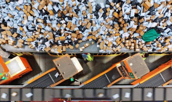 (แฟ้มภาพซินหัว : เจ้าหน้าที่กำลังคัดแยกพัสดุที่สาขาของไปรษณีย์จีนในเมืองหยางโจว มณฑลเจียงซูทางตะวันออกของจีน วันที่ 10 พ.ย. 2025)