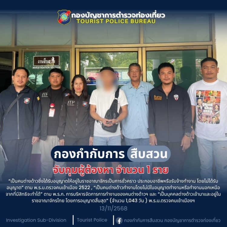 เมื่อวันที่ 12 พฤศจิกายน 2568 เจ้าหน้าที่ได้ตรวจพบเพจ “ข่าววงการท่องเที่ยว” เผยภาพบุคคลใช้บัตรไกด์ลักษณะปลอม จึงเริ่มสืบสวนจนทราบว่าพักอยู่โรงแรมบนเขาพระตำหนัก เมืองพัทยา ก่อนเฝ้าติดตามจนพบชายต้องสงสัยในเช้าวันที่ 13 พฤศจิกายน กำลังเดินทางมากับกรุ๊ปทัวร์จีนในพื้นที่ตำบลนาจอมเทียน