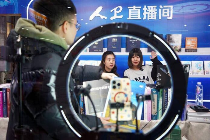 (แฟ้มภาพซินหัว : พนักงานประชาสัมพันธ์หนังสือผ่านการไลฟ์สดระหว่างงานมหกรรมหนังสือปักกิ่ง ปี 2025 ในกรุงปักกิ่งของจีน วันที่ 9 ม.ค. 2025)