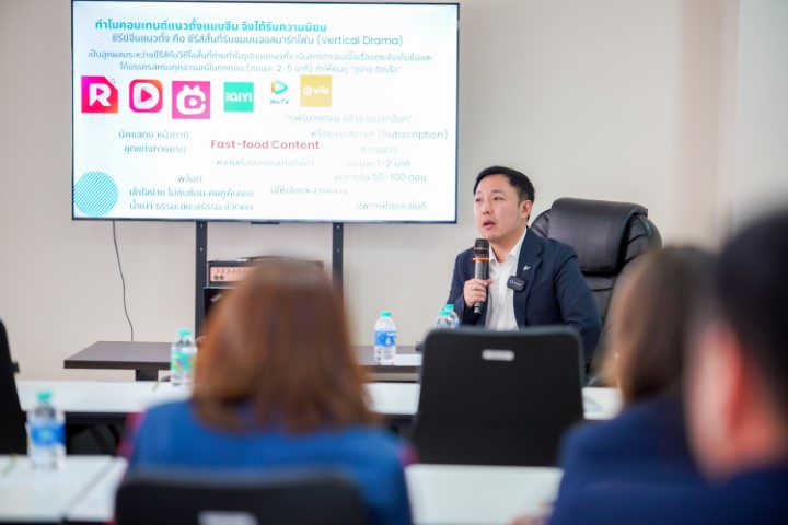 สำหรับการบรรยายในหัวข้อแรกเรื่องเอนเตอร์เทนเมนท์ระหว่างไทย-จีน ผศ.ดร.สรรพัชญ์ เจียระนานนท์ ได้ชี้ให้เห็นถึงการเปลี่ยนแปลงครั้งสำคัญของอุตสาหกรรมบันเทิงที่ถูกขับเคลื่อนด้วยพฤติกรรมผู้บริโภคและเทคโนโลยี โดยเฉพาะการก้าวเข้าสู่ยุคของละครแนวตั้งหรือไมโครดราม่า ซึ่งมีต้นกำเนิดและเติบโตอย่างก้าวกระโดดจากประเทศจีน การเปลี่ยนแปลงนี้ไม่ใช่เพียงแค่การเปลี่ยนสัดส่วนภาพจากแนวนอนเป็นแนวตั้งเท่านั้น แต่เป็นการปฏิวัติวิธีเล่าเรื่องให้กลายเป็นคอนเทนต์แบบอาหารจานด่วนที่เน้นความรวดเร็ว กระชับ และเข้าถึงง่าย โดยละครแต่ละตอนจะมีความยาวเพียง 1-3 นาที และถูกออกแบบให้มีจุดดึงดูดหรือฮุกทุก ๆ 10 วินาที เพื่อตอบโจทย์คนรุ่นใหม่ที่มีสมาธิสั้นลงและต้องการความบันเทิงที่สะใจทันทีโดยไม่ต้องปูพื้นหลังเนื้อเรื่องให้ซับซ้อน