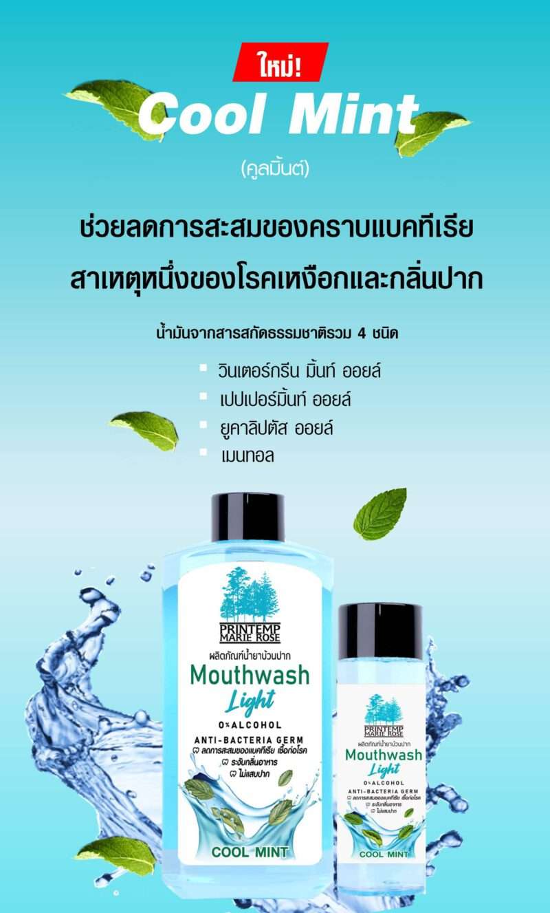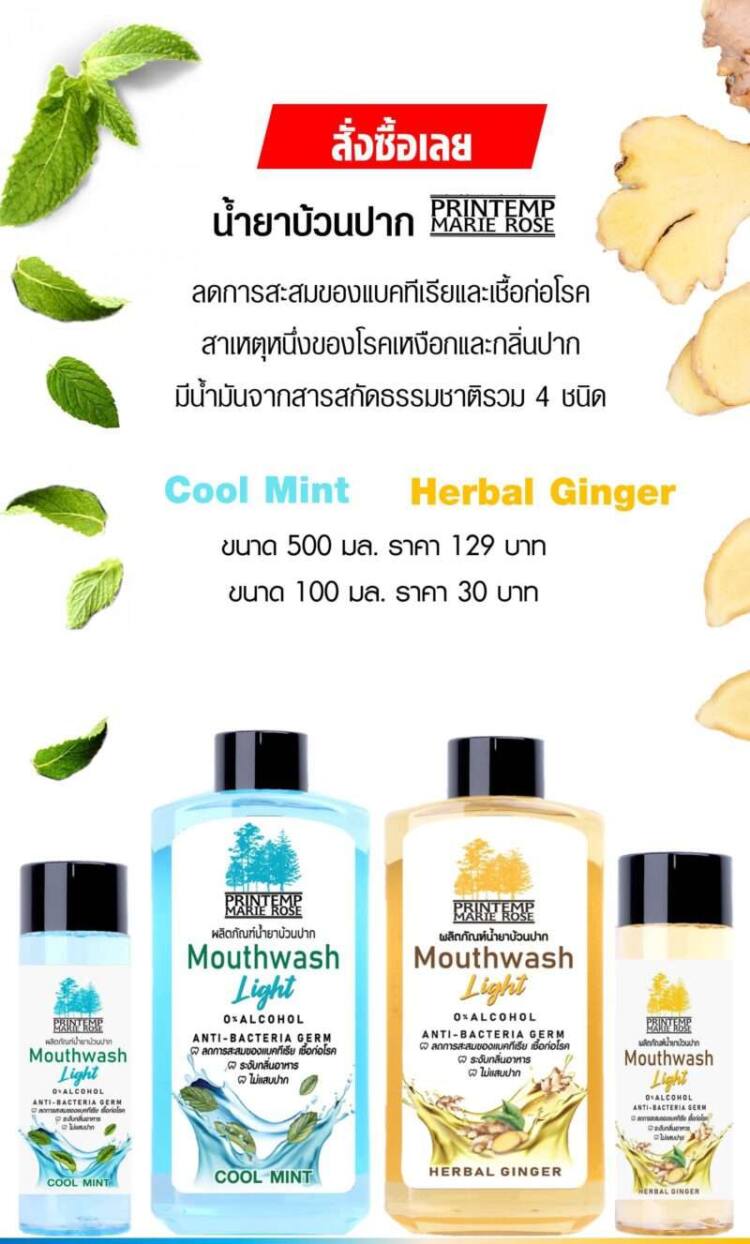 3.น้ำยาบ้วนปาก “แปรงตัง มารี โรส เมาธ์วอช ไลท์ (Printemp Marie Rose Mouthwash Light)” ซึ่งมี 2 กลิ่น คือกลิ่นมินท์กับกลิ่นขิง และกลิ่นขิง