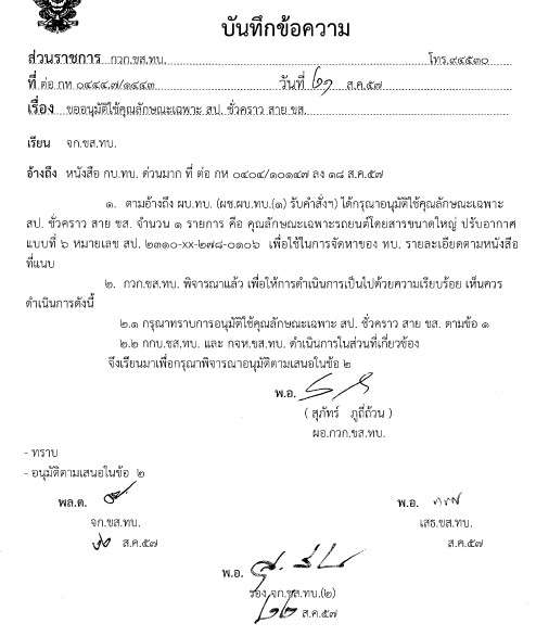 6 ส.ค.2557 พล.ต.สมชาย ยังพิทักษ์ เจ้ากรมส่งกำลังบำรุงทหารบก (กบ.ทบ.) ทำบันทึกถึง ผู้บัญชาการทหารบก (ผบ.ทบ.) ผ่านผู้ช่วยผู้บัญชาการทหารบก (ผช.ผบ.ทบ.1 ) เสนอเห็นควรอนุมัติให้ใช้คุณลักษณะเฉพาะ สป.ชั่วคราวสาย ขส.จำนวน 1 รายการ ได้แก่ รถยนต์โดยสารขนาดใหญ่ ปรับอากาศ แบบที่ 6 หมายเลข สป. 2310-XX-278-0106 เป็นคุณลักษณะเฉพาะ สป.ชั่มคราว สาย ขส. ของขส.ทบ. และใช้เป็นหลักในการจัดหาของ ทบ.เฉพาะในปีงบประมาณ 2557 ผู้ช่วย ผบ.ทบ.1 ลงนามอนุมัติในวันเดียวกัน (ดูเอกสาร)