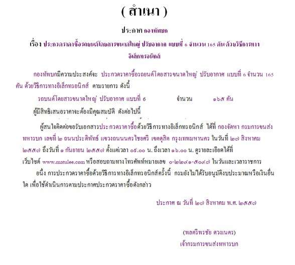 และ การออกประกาศประกวดราคาเมื่อวันที่ 27 ส.ค.2557 ของ สข.ทบ. เกิดขึ้นภายหลังจาก กรมส่งกำลังบำรุงทหารบก ส่งหนังสือด่วนมากแจ้งทราบผลการอนุมัติ ถึง ขส.ทบ. วันที่ 19 ส.ค.2557 และแจ้งเวียนให้หน่วยงานของ ขส.ทบ. รับทราบวันที่ 21 ส.ค.2557 (เจ้ากรม ขส.ทบ. กับ รองเจ้ากรมฯ ลงนามรับทราบวันที่ 22 ส.ค.2557) ประมาณ 5 วัน