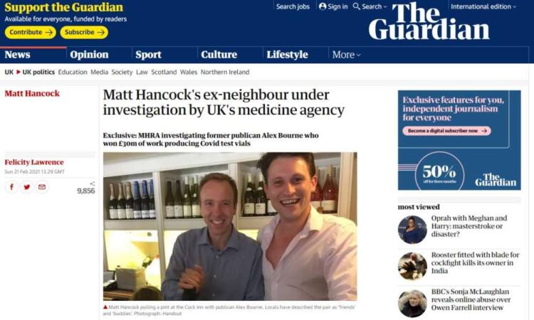 โดยเมื่อวันที่ 21 ก.พ.ที่ผ่านมา สำนักข่าวการ์เดี้ยนของอังกฤษได้เผยแพร่รายงานข่าวว่าอดีตเพื่อนบ้านของนายแมตต์ แฮนค็อก รัฐมนตรีว่าการกระทรวงสาธารณสุขกำลังถูกสอบสวนจากหน่วยงานด้านสาธารณสุขของอังกฤษ หลังจากที่พบว่าเพื่อนบ้านรายนี้ซึ่งเป็นอดีตเจ้าของผับนั้นได้รับสัญญาให้ผลิตหลอดแก้วสำหรับหลอดชุดตรวจโควิดนับล้านหลอดให้กับหน่วยงานบริการสาธารณสุขของอังกฤษหรือ NHS คิดเป็นมูลค่าสัญญาทั้งสิ้น 30 ล้านปอนด์ (1,273,415,342 บาท)