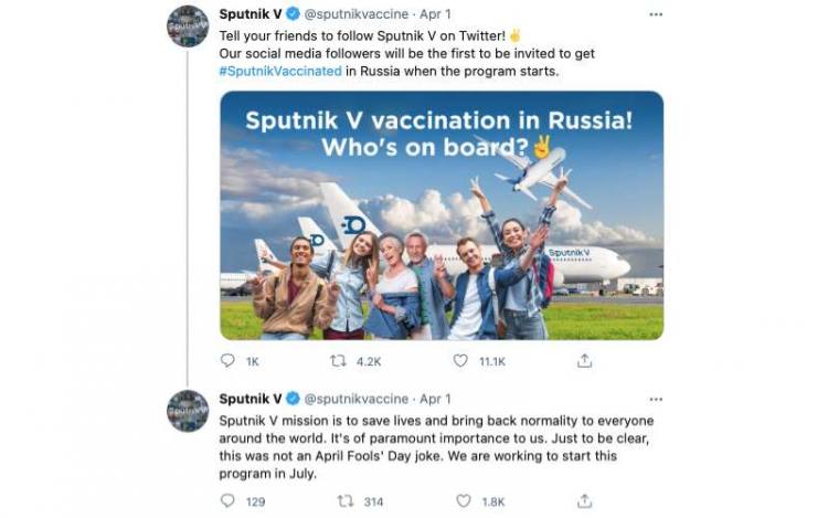 ขณะที่บัญชีทวิตเตอร์ทางการของสปุตนิกวีเคยทวีต 2 ข้อความ ระบุว่า “บอกเพื่อนของคุณให้ติดตามสปุตนิก วี บนทวิตเตอร์ ผู้ติดตามโซเชียลมีเดียของเราจะเป็นคนแรกที่ได้รับเชิญให้รับวัคซีนสปุตนิก วี ในรัสเซียเมื่อโปรแกรมเริ่มต้น”