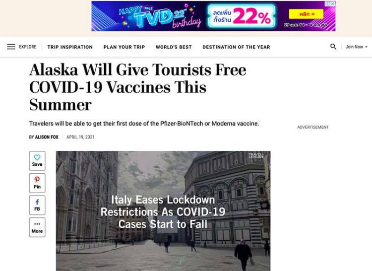 ขณะที่ บางรัฐของสหรัฐอเมริกามีนโยบายให้วัคซีนกับนักท่องเที่ยวด้วย เว็บไซต์ Travel Leisure รายงานว่า รัฐอลาสก้าจะเสนอฉีดวัคซีนโควิด ยี่ห้อไฟเซอร์ และโมเดอร์นาให้ฟรีกับนักท่องเที่ยว เพื่อส่งเสริมและกระตุ้นอุตสาหกรรมการท่องเที่ยวที่ประสบปัญหาอย่างหนักจากการห้ามล่องเรือและการห้ามเดินทางทั่วไป