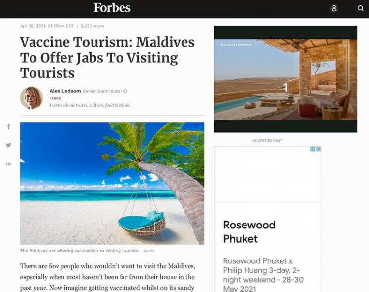 มัลดีฟส์ เป็นอีกหนึ่งแหล่งท่องเที่ยวที่สำคัญ ที่ได้รับผลกระทบอย่างมากจากการระบาดของโควิด ซึ่งเว็บไซต์ Forbes รายงานว่า ปัจจุบันมัลดีฟส์เปิดเกาะให้บริการสำหรับนักท่องเที่ยวที่ได้รับวัคซีนครบโดสแล้ว รวมถึงนักเดินทางที่มีผลทดสอบโควิดเป็นลบก่อนเดินทางไม่เกิน 3 วัน และจะเปิดตัวแคมเปญ 3V คือ ‘Visit Vaccinate Vacation’ หรือ ‘เยี่ยมเยือน รับวัคซีน พักผ่อน’ เพื่อรับนักท่องเที่ยวต่างชาติด้วย